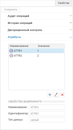 Примечание. При разделении ролей вкладка «Атрибуты» будет доступна только администратору информационной безопасности с привилегией «Изменение прав пользователей, раздача ролей, изменение политики», «Изменение метки безопасности и списка контроля доступа любого объекта».