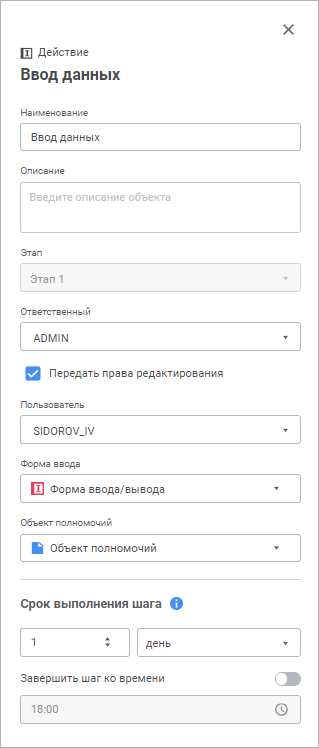 На странице «Описание шага» для шага «Ввод данных» определите: