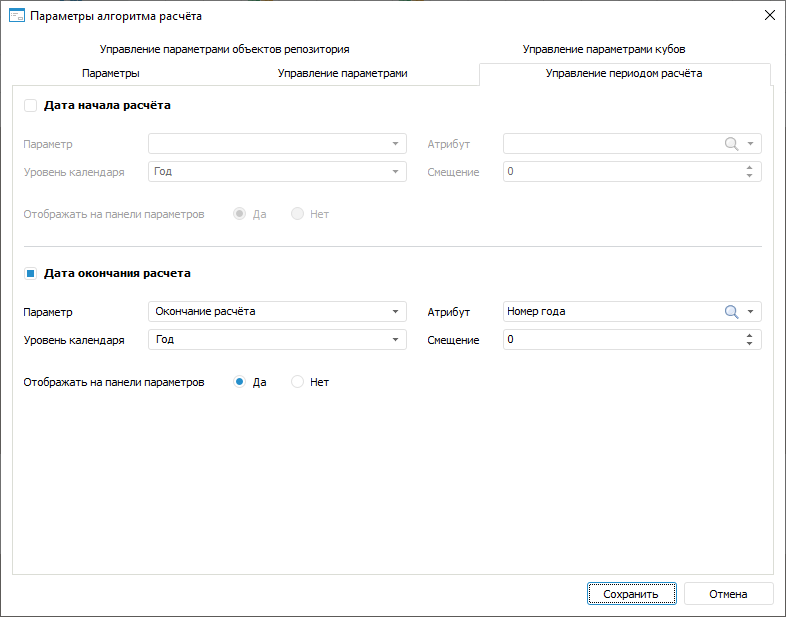 В результате начало расчёта будет управляться параметром алгоритма и параметр «Начало периода» на панели параметров станет недоступен. Выбор и настройка параметра, управляющего окончанием расчёта, выполняется аналогично.