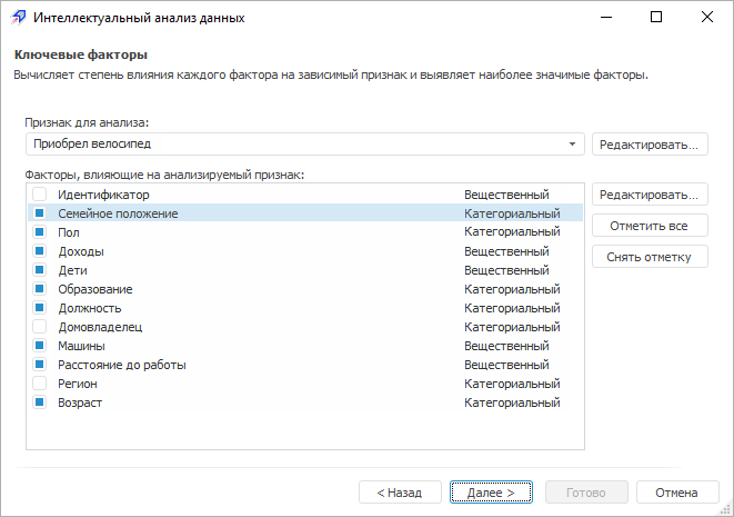 Данный вид анализа вычисляет степень влияния каждого фактора на зависимый признак и выявляет наиболее значимые факторы.