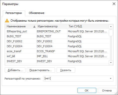 Примечание. Список репозиториев сохраняется в реестре операционной системы. Пользователь операционной системы, под которым осуществляется работа со списком репозиториев, должен обладать правами на внесение изменений в реестр.