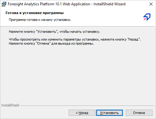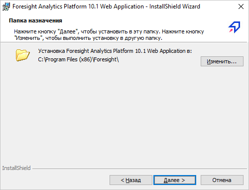 На следующем этапе мастер установки предложит папку, в которую будет установлено веб-приложение «Форсайт. Аналитическая платформа». По умолчанию предлагается папка «C:\Program Files (x86)\Foresight\» или «C:\Program Files\Foresight\» в зависимости от разрядности операционной системы. Для изменения папки нажмите кнопку «Изменить».