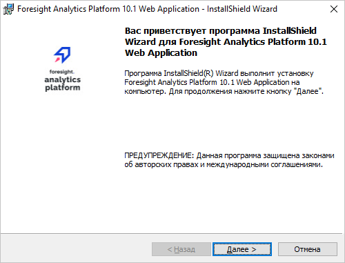 Для начала установки запустите файл FP10WebServer.exe. После запуска программа установки проверяет наличие более ранней сборки устанавливаемой версии продукта «Форсайт. Аналитическая платформа» и в случае обнаружения будет предложено обновление продукта «Форсайт. Аналитическая платформа».