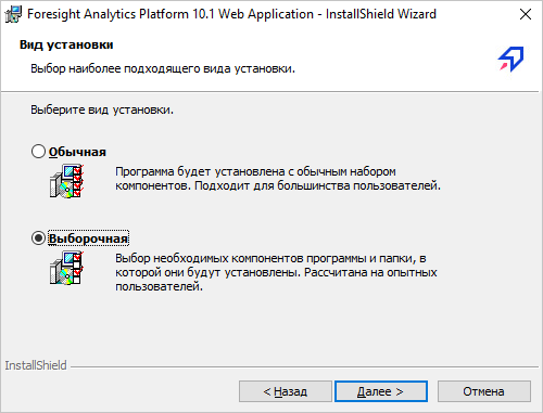 На следующей странице установите переключатель на необходимом типе установки. По умолчанию осуществляется обычная установка. Возможность выбора устанавливаемых компонентов, в том числе консоли веб-сервисов, будет доступна при выборочной установке.