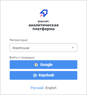 Выберите репозиторий и нажмите кнопку одного из сервисов авторизации. После чего будет осуществлен переход на страницу учётной записи соответствующего сервиса, например, Keycloak. Введите имя пользователя и пароль на странице сервиса. При успешной авторизации в веб-приложении будет открыт навигатор объектов.