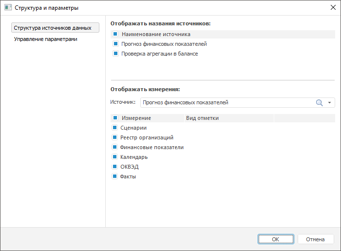 Для настройки структуры источника данных используйте вкладку «Структура источника данных» в диалоге «Структура и параметры». В зависимости от количества источников данных экспресс-отчёта вид окна будет различным.