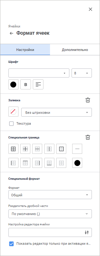 Для настройки оформления ячеек используйте группу параметров «Формат ячеек» панели параметров: