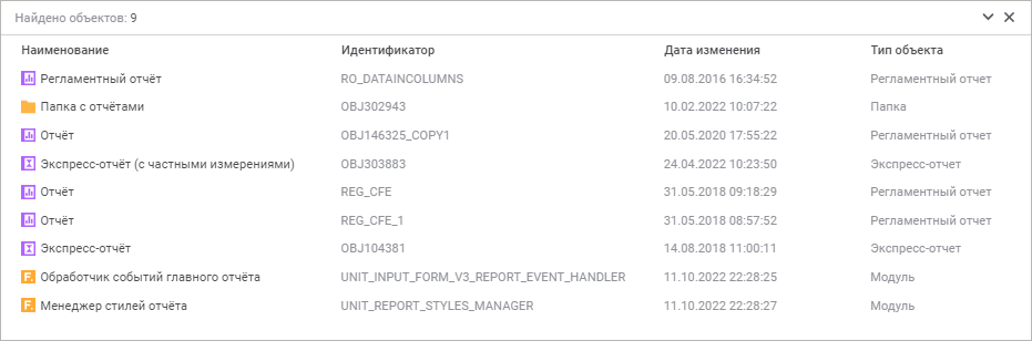 Поиск объекта может осуществляться как по всему репозиторию, так и в текущей папке. Для удобства можно найти все объекты, удовлетворяющие заданным условиям. Объекты будут выведены в панель «Результаты поиска».