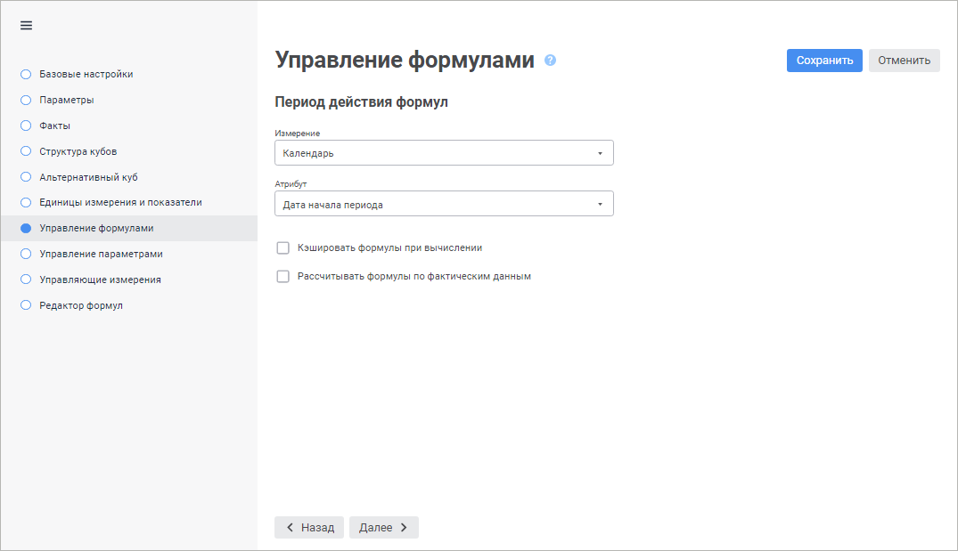 На странице «Управление формулами» укажите атрибут измерения, который будет управлять выбором периода действия формул.