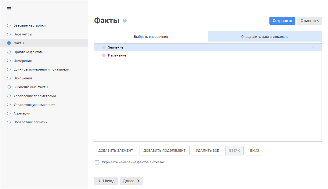Для определения списка и иерархии фактов куба перейдите на страницу «Факты куба» мастера стандартного куба: