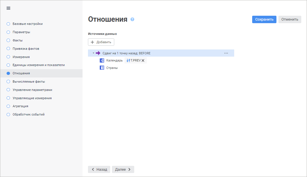 Отношения позволяют получать значения фактов путём смещения относительно текущей точки расчёта. Используются при формировании выражений вычисляемых фактов куба.