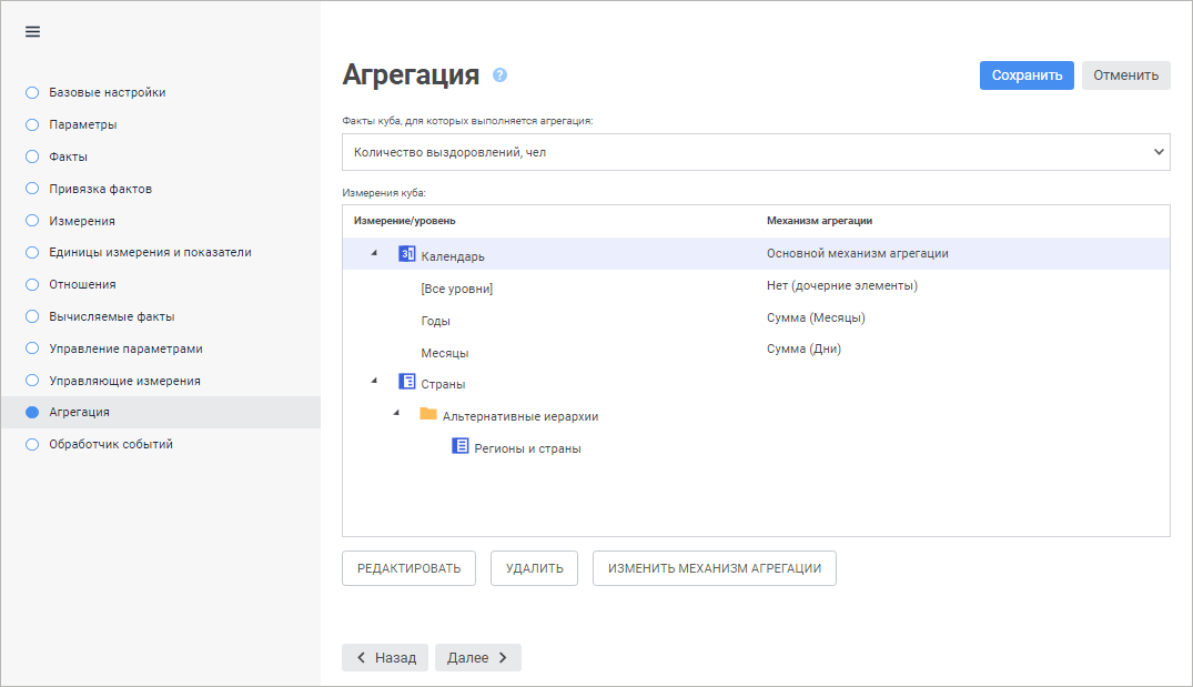 На данной странице настраиваются варианты отображения и агрегация для измерений куба. Подробное описание настройки различных механизмов агрегации представлено в разделе «Агрегация по уровням измерения». При открытии куба извлекаются неагрегированные данные. Агрегация данных производится непосредственно в открытом кубе на компьютере-клиенте.