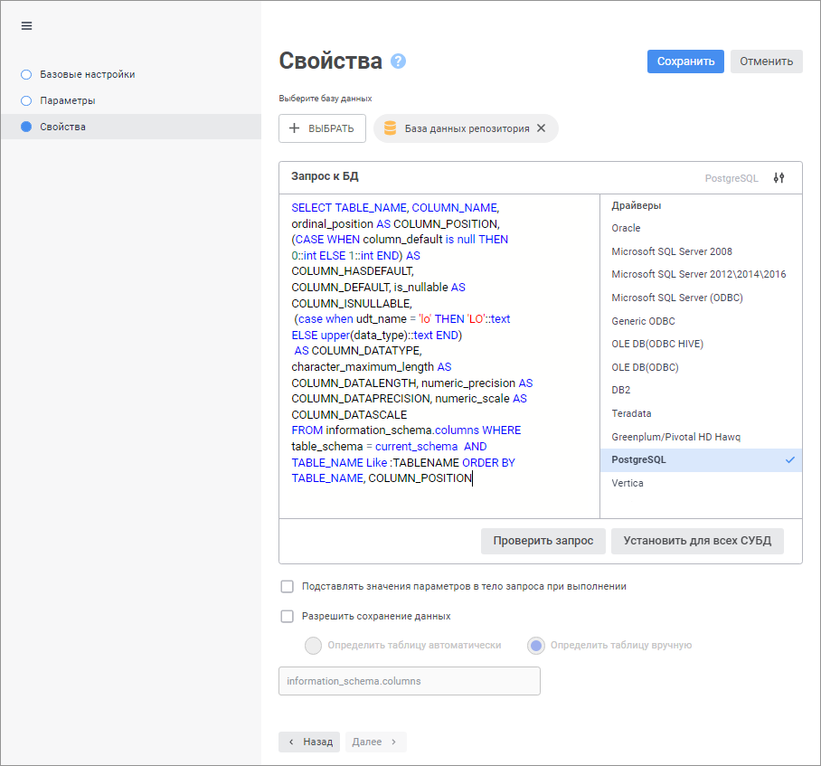 Напротив поля «Запрос к БД» отображается выбранный драйвер СУБД и список драйверов. По умолчанию в списке драйверов выделен драйвер, используемый при настройке подключения к репозиторию. Если для одного или нескольких драйверов указан запрос, то в списке драйверов будет установлена отметка.