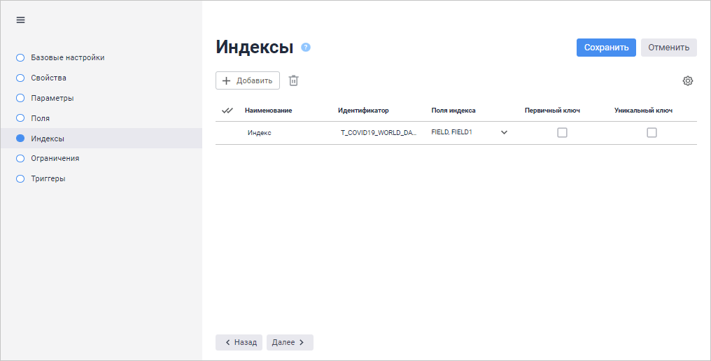 На странице «Индексы» задаётся список индексов таблицы. Индексирование обеспечивает быстрый поиск и выборку значений, а также соблюдение уникальности значений определенных полей. Часто поиск осуществляется по различным полям или группам полей. В таких случаях есть смысл создавать несколько индексов.