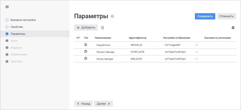 На странице «Параметры» задаётся список параметров объекта. Параметры позволяют формировать содержимое объекта динамически.
