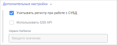 Примечание. В веб-приложении доступны некоторые параметры: «Учитывать регистр при работе с СУБД», «Использовать GSS API», «Сервис Kerberos».