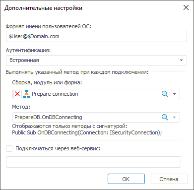 Сборка, модуль или форма. Вне зависимости от типа используемой СУБД можно определить макрос, который будет выполняться при каждом подключении. Для этого из раскрывающегося списка выберите модуль/форму/сборку, где имеется реализация макроса. При этом в раскрывающемся списке «Метод» будет сформирован список доступных для использования методов. Доступными для использования являются статические процедуры, имеющие только один параметр с типом ISecurityConnection: