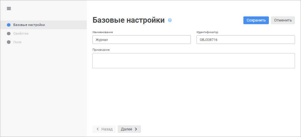 Базовые настройки/Базовые свойства. Задаются наименование объекта, идентификатор и примечание;