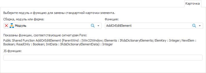 Вкладка «Карточка» используется для переопределения предустановленного вида диалога «Свойства элемента справочника» на пользовательский.