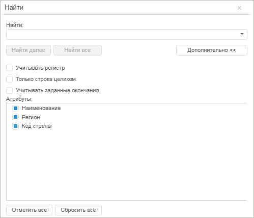 Атрибуты. Можно установить флажки для тех атрибутов, по которым требуется осуществить поиск. По умолчанию флажки установлены для всех видимых атрибутов. Скрытые атрибуты в списке не отображаются. Также установить/снять отметку для всех атрибутов элементов можно с помощью кнопок «Отметить все», «Сбросить все».