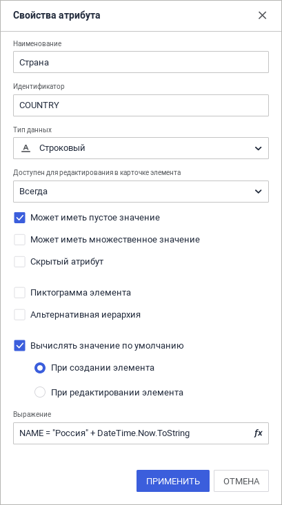 Для всех системных атрибутов в окне «Свойства атрибута» возможно редактирование наименования и назначения атрибута. Также для всех системных атрибутов кроме атрибута «Наименование (NAME)» можно изменить настройку отображения атрибута в справочнике «Скрытый атрибут». Для атрибута «Наименование (NAME)» доступна настройка «Вычислять значение по умолчанию». В поле «Выражение» установите формулу, с помощью которой будет формироваться наименование элемента.