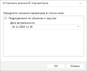 После установки флажка при каждом открытии справочника на просмотр в веб-приложении будет открываться диалог «Установка значений параметров», в котором можно задать параметр «Дата актуальности»: