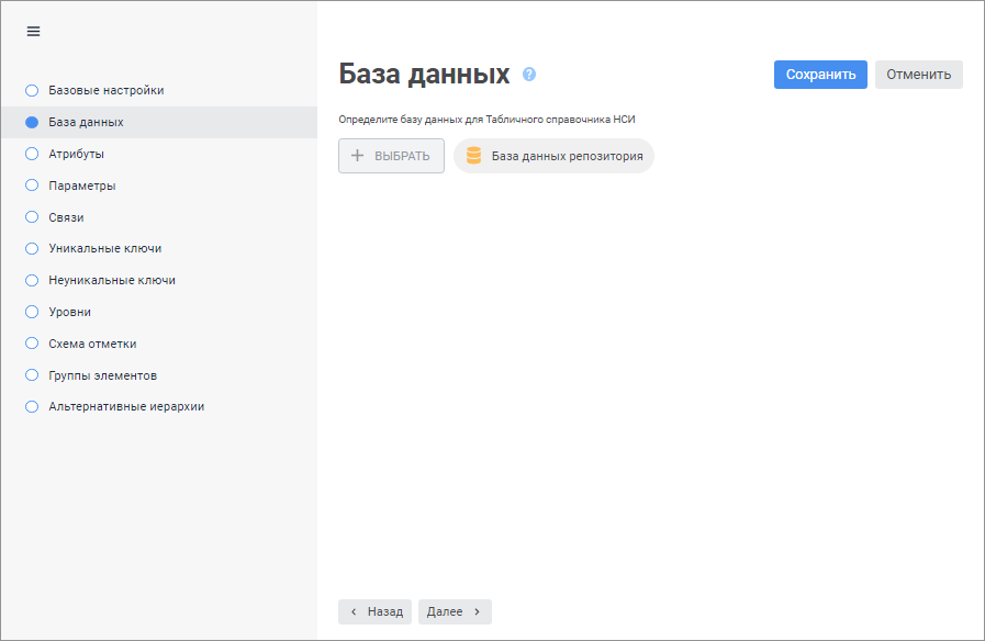 Для создания справочника НСИ требуется база данных для хранения данных справочника. Для выбора базы данных перейдите на страницу «База данных» мастера настройки структуры справочника: