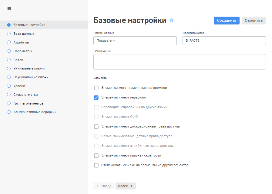 Описание элементов мастера настройки структуры справочника НСИ в веб-приложении приведено в разделе «Настройка структуры справочника».