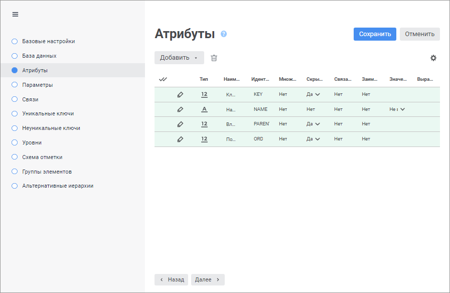 Для создания и настройки атрибутов справочника НСИ перейдите на страницу «Атрибуты» мастера настройки структуры справочника:
