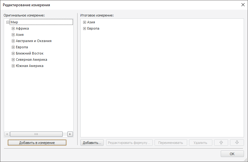 В области «Оригинальное измерение» отображаются элементы измерения до редактирования. В области «Итоговое измерение» - список элементов после редактирования.
