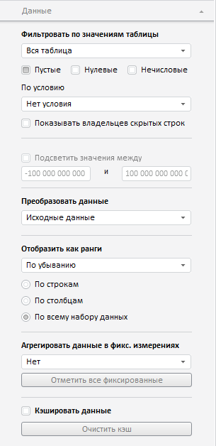 | getState | Метод getState возвращает объект со значениями, определяемыми элементами управления в разделах «Фильтровать по значениям таблицы» и «Агрегировать данные в фикс. измерениях» на вкладке «Данные». |