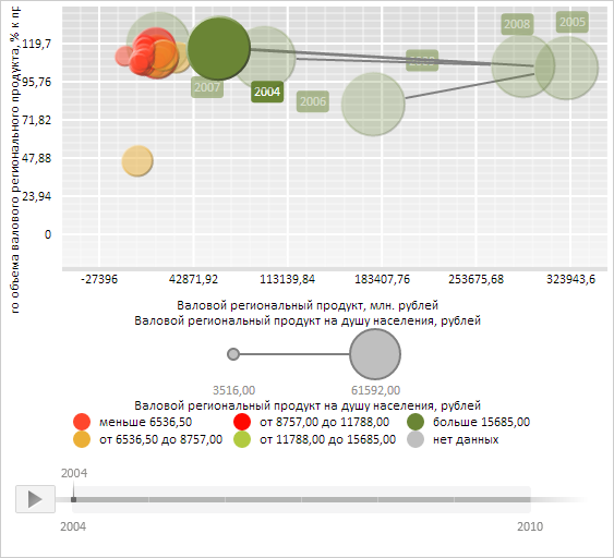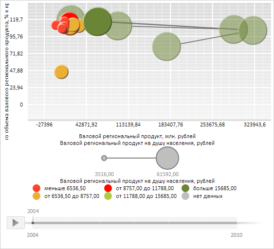 Для выполнения примера необходимо наличие на html-странице компонента BubbleChart с наименованием «bubbleChart» (см. «Пример создания компонента BubbleChart»). До выполнения примера в истории значений для пузырьков пузырьковой диаграммы отображаются подписи с указанием года: