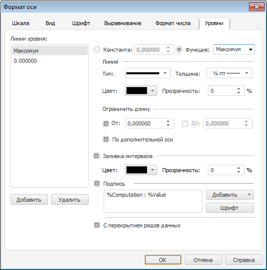 Для настройки линии уровня используйте вкладку «Уровни» диалогового окна «Формат оси». Настройка линий уровня с помощью диалогового окна «Формат оси» доступна только в настольном приложении. Для лепестковой диаграммы настройка линий уровня с помощью диалогового окна «Формат оси» доступна только для оси категорий (X).
