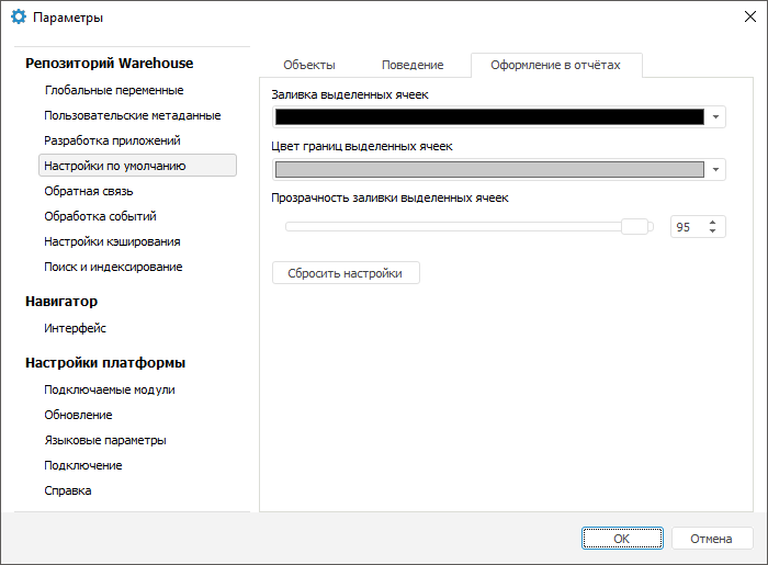 Для настройки оформления выделенных ячеек таблицы в отчётах по умолчанию используйте вкладку «Оформление в отчётах»: