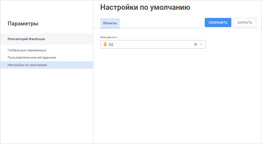 Для задания объектов репозитория по умолчанию используйте вкладку «Объекты»:
