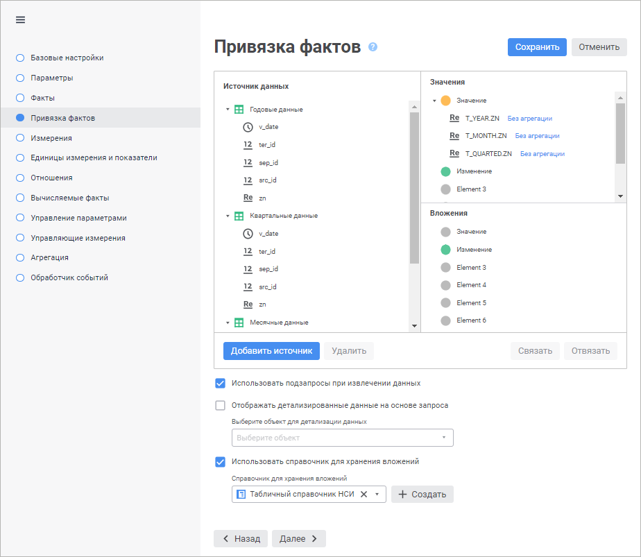 Для проецирования структуры куба на источник данных сопоставьте факты куба и поля источника. Разные факты куба могут быть связаны с полями различных источников данных и различными календарными уровнями: