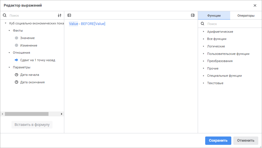 Окно редактора выражения для настройки вычисляемых фактов стандартного куба в веб-приложении имеет вид: