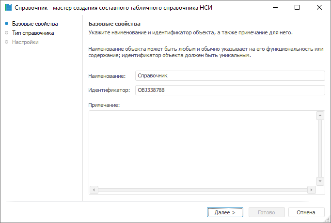 На странице «Базовые свойства» задаются наименование справочника, идентификатор и примечание: