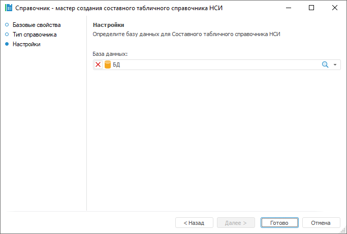 На странице «Настройки» выбирается база данных для хранения данных справочника: