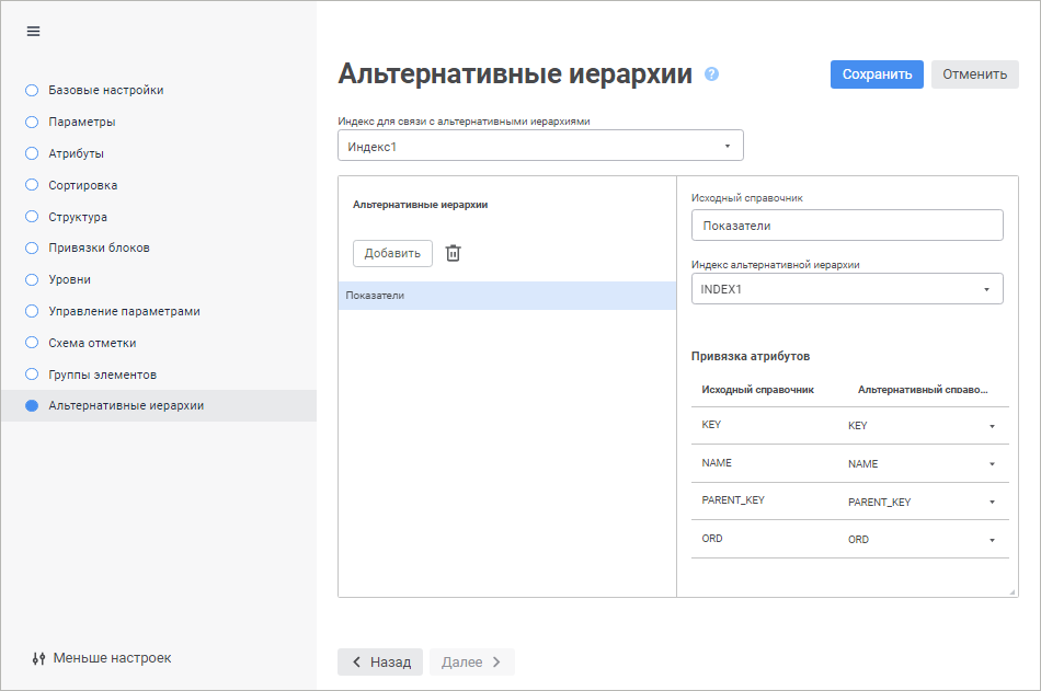 Для настройки альтернативных иерархий на основе справочника используйте страницу «Альтернативные иерархии» мастера создания справочника в веб-приложении или окно «Альтернативные иерархии» в настольном приложении.