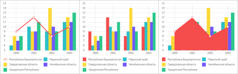 Ниже приведён пример смешанной диаграммы с различными настройками одного из рядов данных («Линия», «Столбик» и «Область» соответственно):