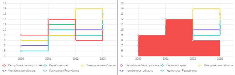 Ниже приведён пример ступенчатой диаграммы с различными настройками одного из рядов данных («Ступенчатый график» и «Ступенчатый областной» соответственно):