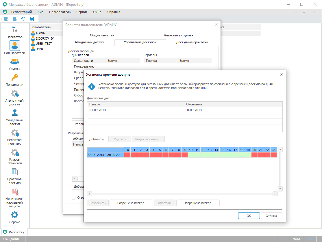 Для администрирования и контроля доступа используйте инструмент «Менеджер безопасности»: