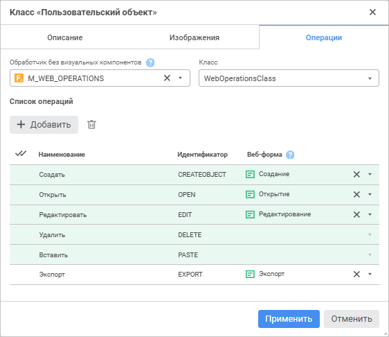 Для настройки операций, которые будут доступны для объектов пользовательского класса, используйте вкладку «Операции» в окне «Класс <наименование класса>».