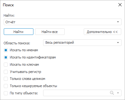 Учитывать регистр. Поиск будет осуществляться с учётом регистра букв. Например, если в поле поиска указано «Отчёт», то объекты, содержащие в наименовании и/или идентификаторе «отчёт» и «ОТЧЁТ», найдены не будут;