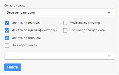 Поиск объекта может осуществляться как по всему репозиторию, так и в текущей папке. Для удобства можно найти все объекты, удовлетворяющие заданным условиям. Объекты будут выведены в панель «Результаты поиска».