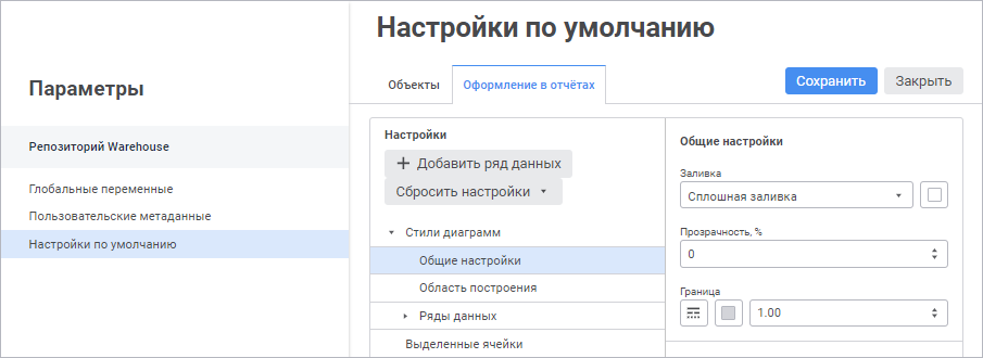 Для настройки стилей диаграмм в отчётах используйте группу параметров «Стили диаграммы» в области «Настройки» и задайте параметры: