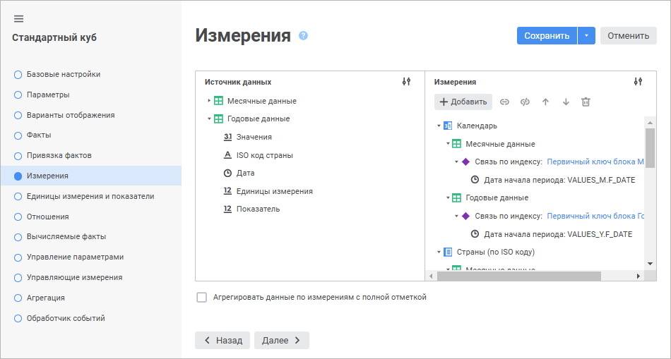 Флажок «Агрегировать данные по измерениям с полной отметкой» определяет признак доступности метода агрегации «Из фактов источника» для фиксированных измерений в отчётах. По умолчанию флажок не установлен.