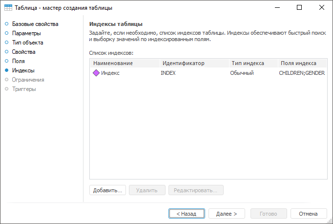 На странице «Индексы» задаётся список индексов таблицы. Индексирование обеспечивает быстрый поиск и выборку значений, а также соблюдение уникальности значений определенных полей. Часто поиск осуществляется по различным полям или группам полей. В таких случаях есть смысл создавать несколько индексов.