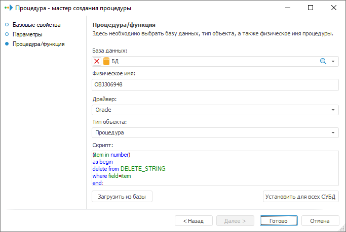 На странице «Процедура/Функция» выбирается база данных, драйвер, указывается тип объекта и скрипт.
